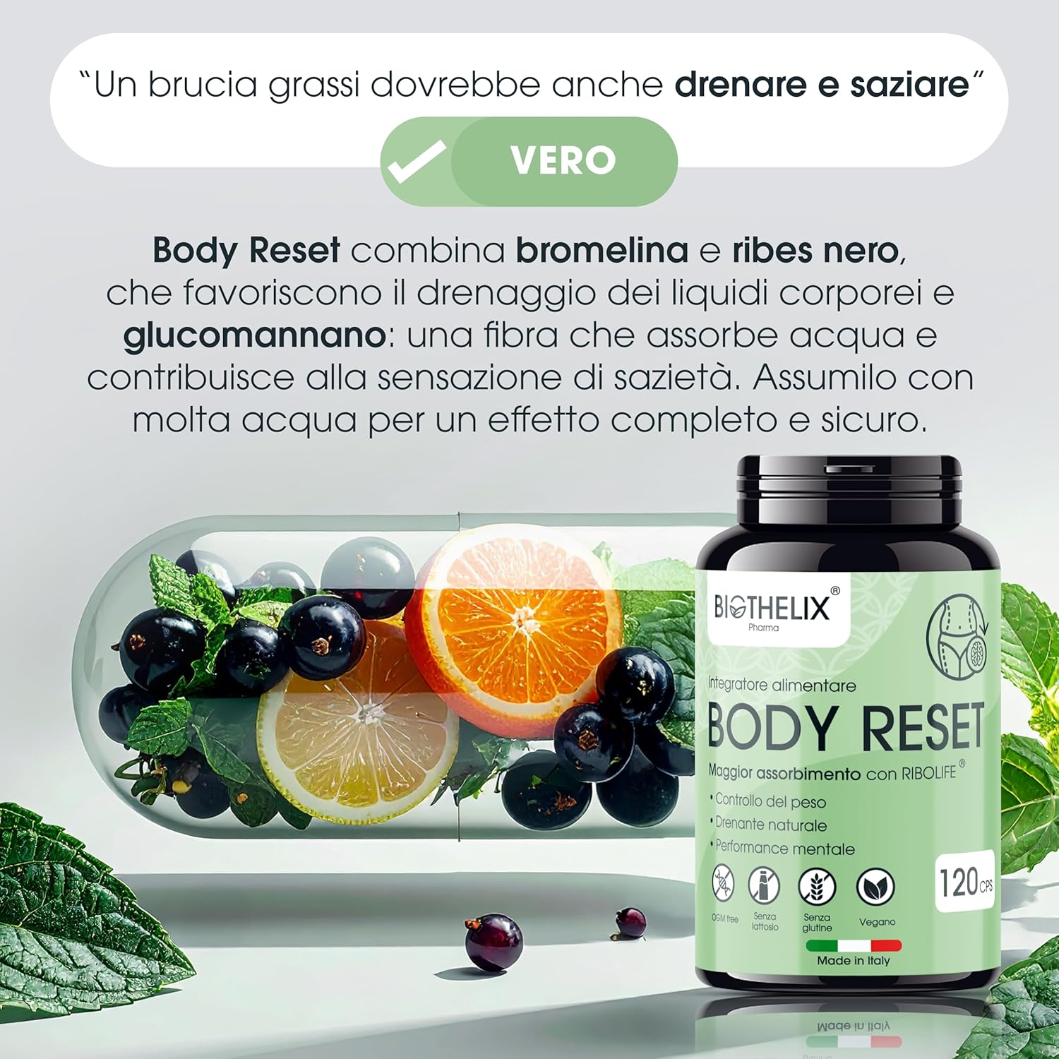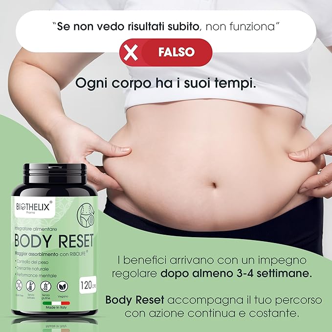 La formula di Body Reset è priva di caffeina, piperina, glutine, lattosio e OGM. Il nostro integratore è realizzato in Italia secondo standard elevati di sicurezza e qualità ed è perfetto per chi cerca un approccio naturale e consapevole.